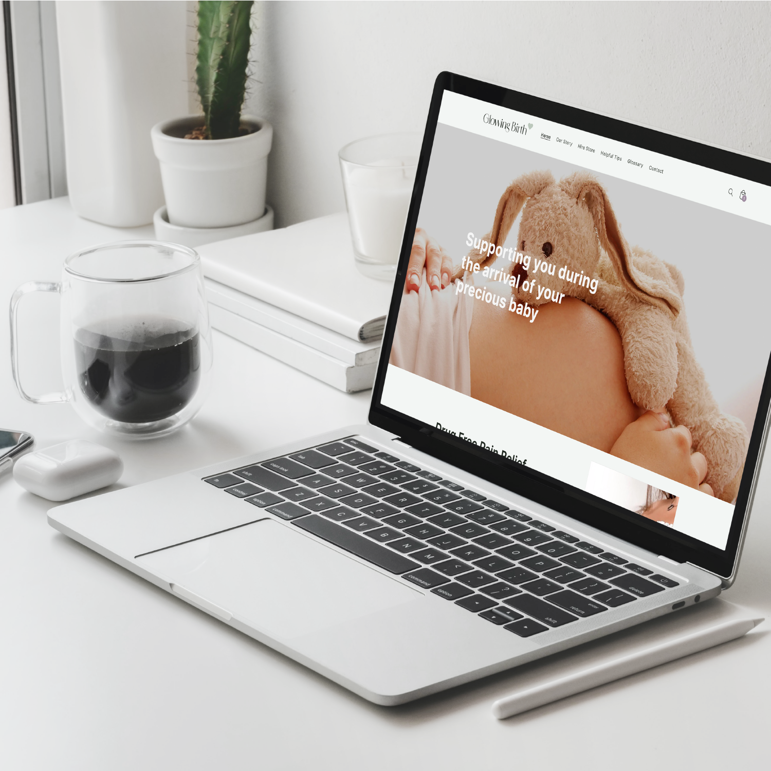 We introduced Glowing Birth—a name that indicates its origins while signalling growth. The brand's aesthetic was revitalized with new colours and logos, embodying a serene and welcoming vibe. Our work culminated in launching a streamlined Shopify website designed to simplify customer interactions, manage hires efficiently, and set Glowing Birth on a trajectory for success. This strategic revamp wasn't just about a new look; it was about setting a strong foundation for the brand's future ambitions.